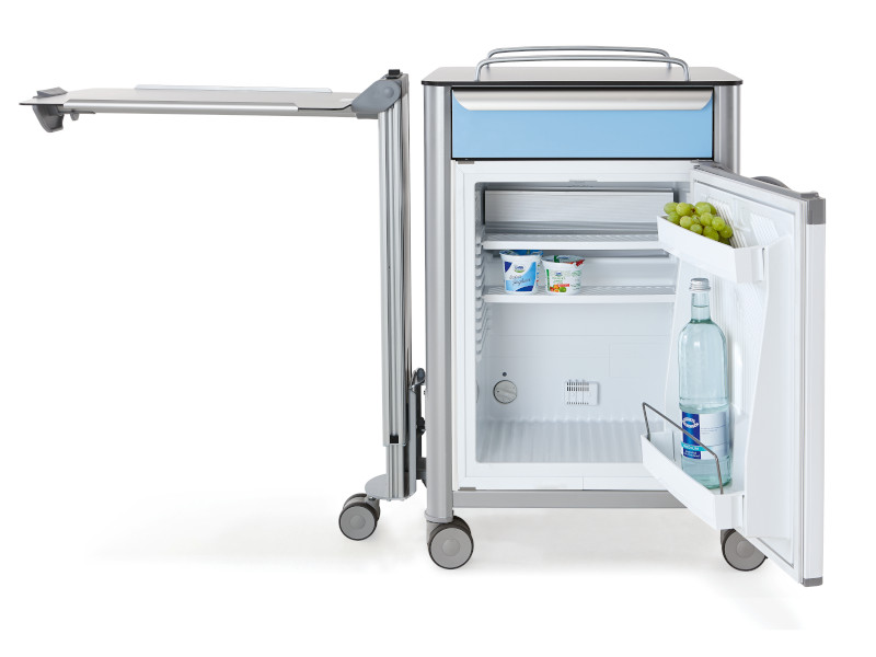 Le réfrigérateur intégré d'une capacité de 41 litres et équipé d'un panier à bouteilles offre un confort particulier au patient.