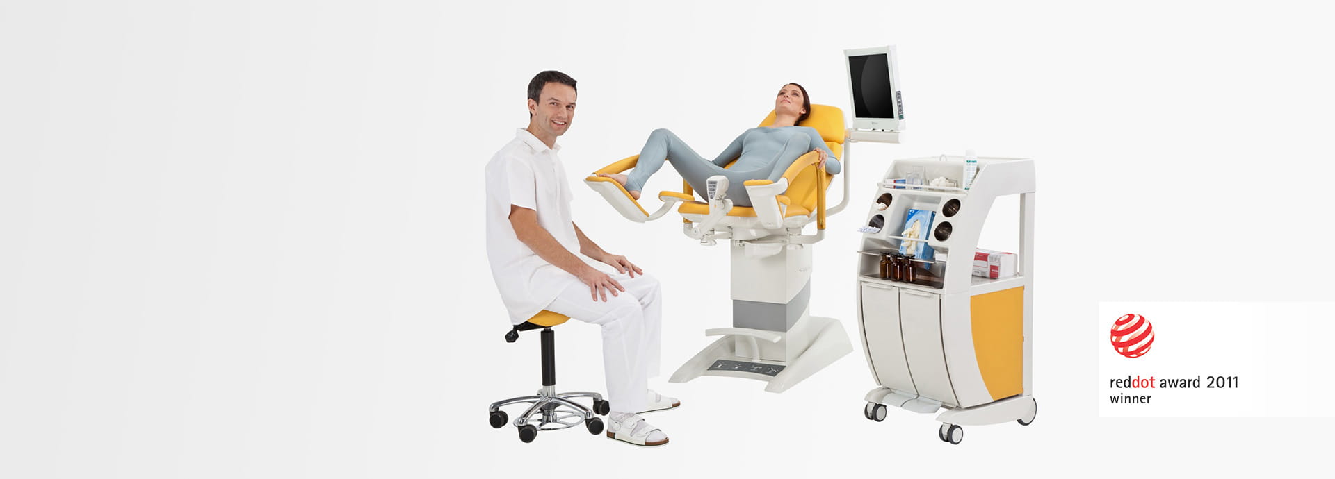 En utilisant une fonction de mémoire, la chaise gynécologique GRACIE peut être réinitialisée sur une chaise longue et un examen ultrasonore abdominal peut être effectué.