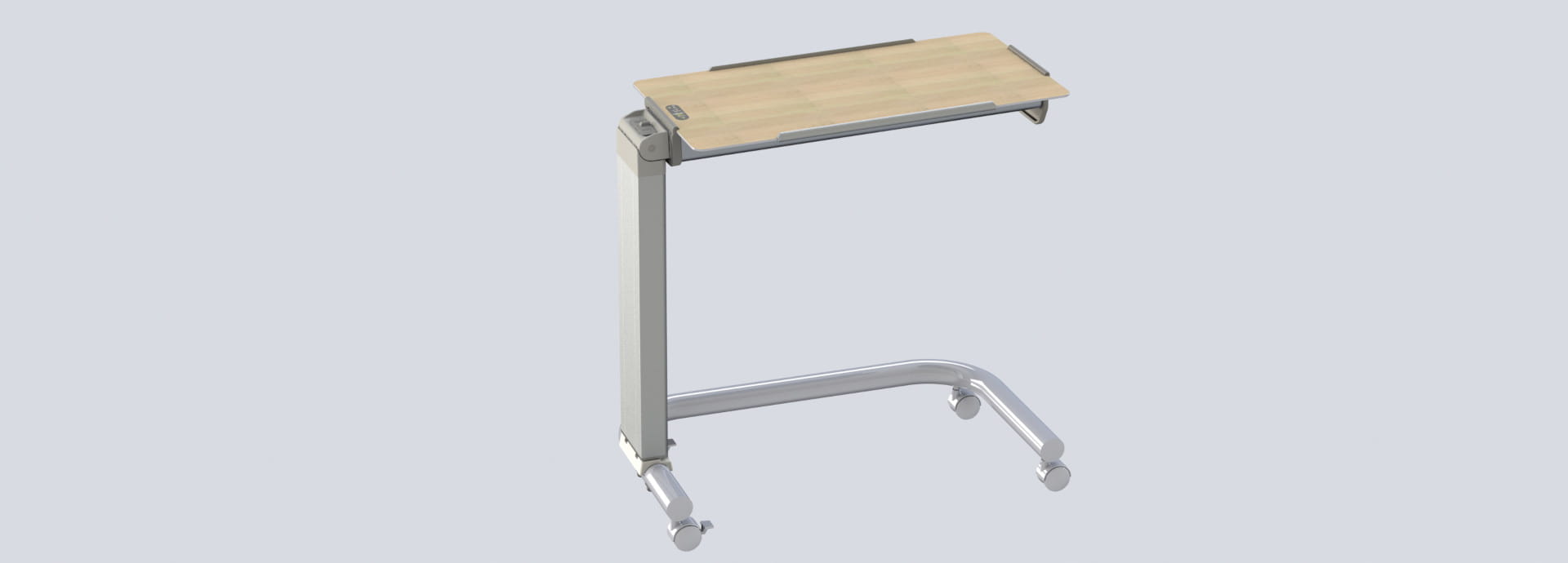 Desserte S3 avec table de lit inclinable et à hauteur réglable. Lorsqu'elle n'est pas utilisée, la desserte peut être rangée pour éviter tout encombrement