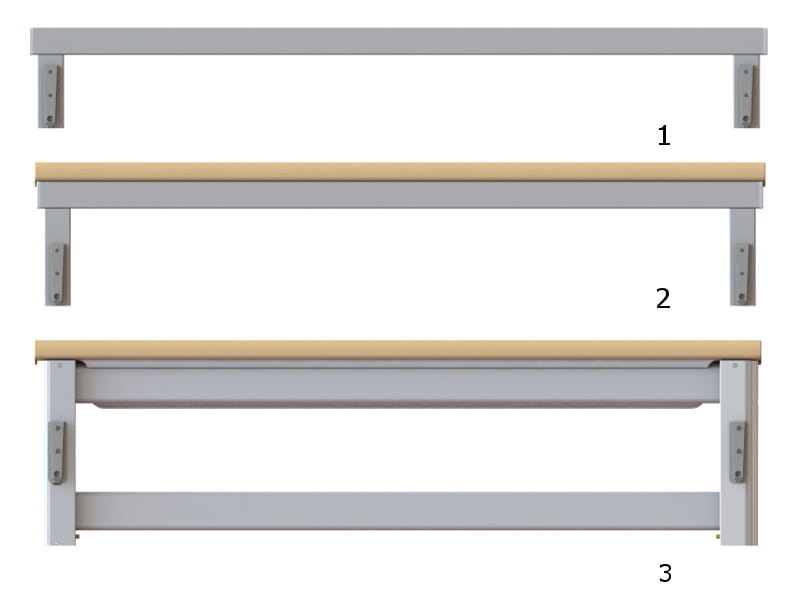 Conversion rapide aux changements de situation du résident — avec espace comblé sans (1) et avec main courante (2) ou demi-barrière entièrement réglable (3)